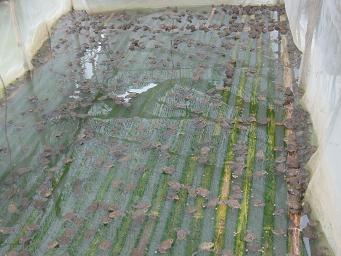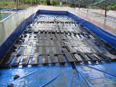 - Một số nơi người ta đóng vĩ tre bỏ vào trong vèo cho ếch nằm thì có nhượt điểm là lâu ngày vĩ tre ngấm nước khi thu hoạch phải lấy vĩ tre ra rất nặng nhọc, nhượt điểm nữa là mật độ nuôi thấp. Tôi khắc phục những nhượt điểm này bằng cách thay vĩ tre bằng đệm lót cao su. Đệm lót cao su đặt dưới đáy vèo nên nuôi mật độ như trên hồ lót bạt.